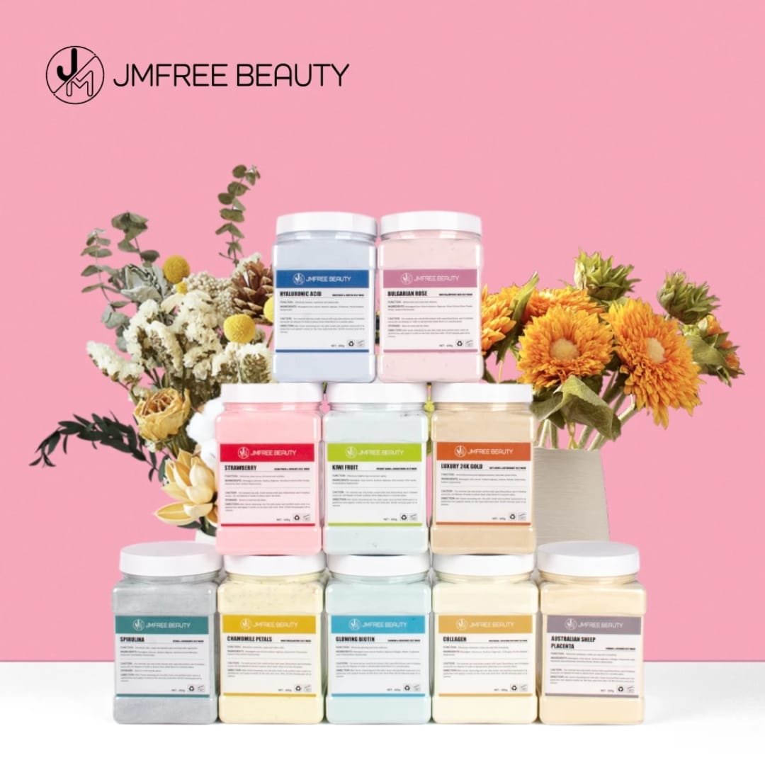 JMFREE Beauty Professional Jelly Mask – A premium skincare powder mask designed to hydrate, brighten, soothe, and rejuvenate the skin instantly. Each formula contains natural extracts suitable for all skin types, including sensitive skin. Perfect for home use and professional salons.