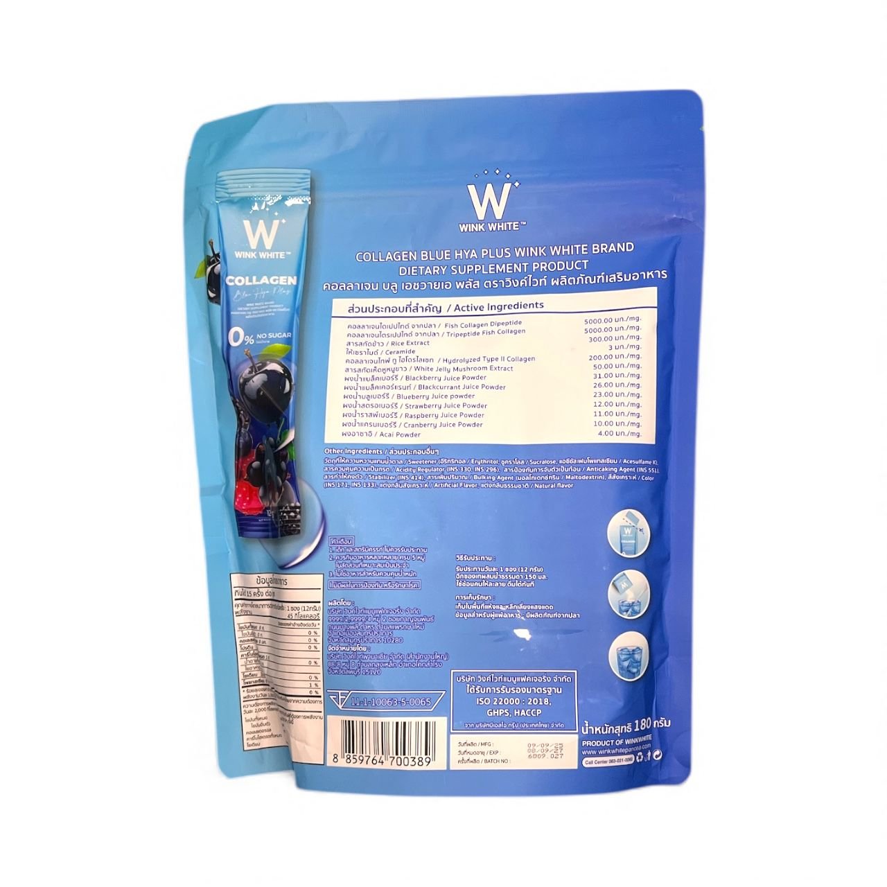 The formula contains Wink White Collagen + Blue Hera drink mix – 15 sachets | 10,000 mg of marine collagen that supports overall health.